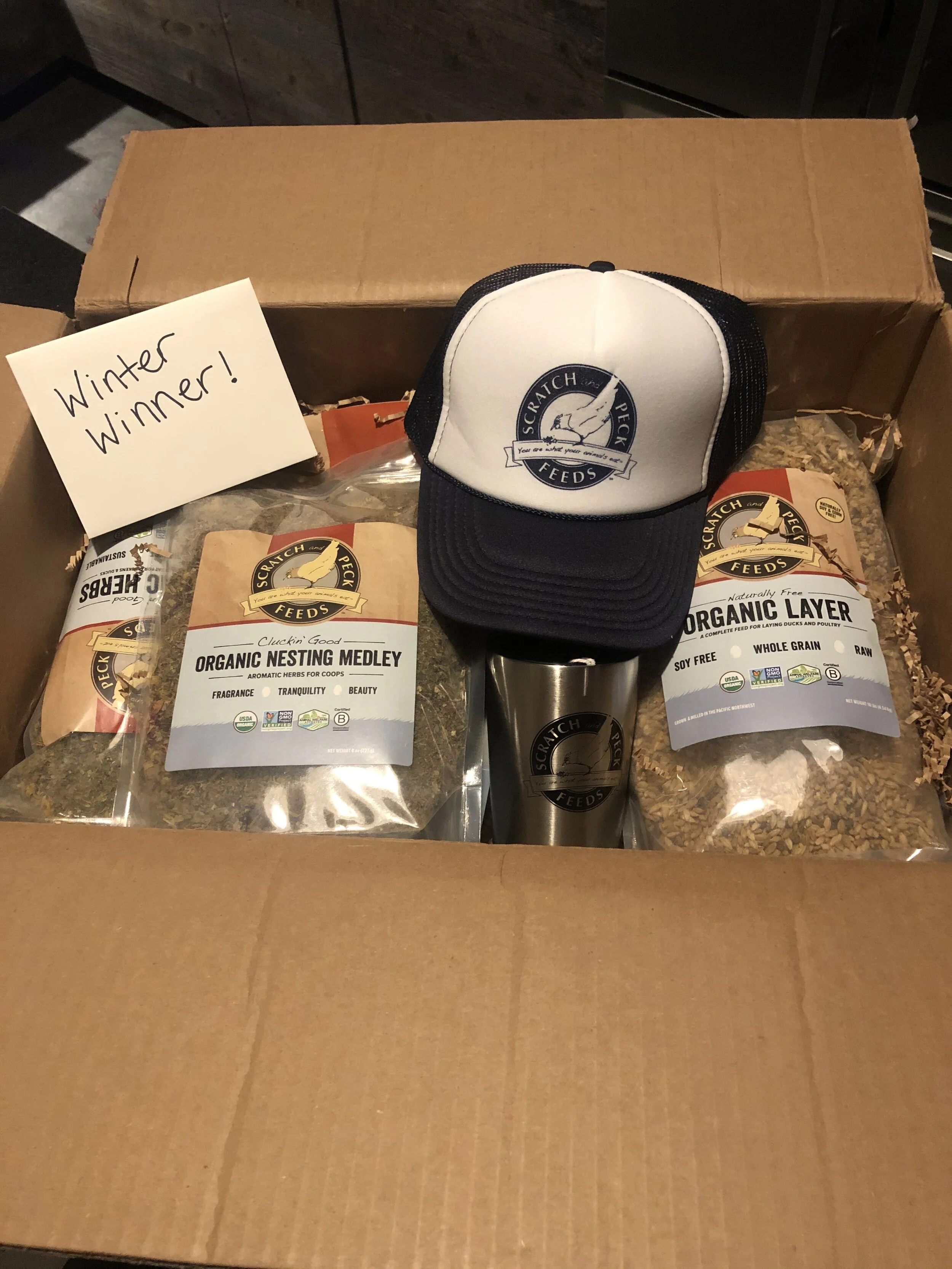 Due to this recommendation, we started supplementing our chickens with Scratch and Peck supplements, which I contribute our winter egg laying and healthy flock to. So how did I end up winning all of this stuff for my flock? Through Instagram! I follow Scratch and Peck on Instagram and they posted about a Winter Winner Giveaway. I was interested, but doubted I would win and entered the contest by liking the picture and commenting. I commented that “I had a good feeling about this one ☝️” and I sure did! A few days later they posted my picture on their instagram as the winner of the giveaway and about a week after that I received this package of goodies in the mail!